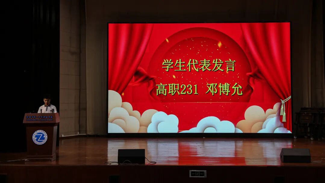 舞蹈落幕后,学生代表高职231班邓博允登台发言。他以“百日倒计时不是压力的叠加,而是梦想的倒计时”为核心,分享了“坚定目标,锚定航向不偏移”“注重积累,脚踏实地不浮躁”“保持从容,笑对挑战不退缩”等备考策略,“逢山开路、遇水架桥”的行动力,在这一百天里全力以赴、奋勇争先。相信百日之后,我们都能带着努力的成果,自信地走向考场,迎来属于自己的高光时刻!”掷地有声的宣言赢得全场掌声。
