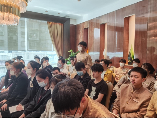 座谈会上,企业领导热烈欢迎邓校和实习班主任们的到来。接着由我们的实习生自愿发言,讲自己的实习感受和启发。同学们表示,在这里学会了很多东西,有了很大的进步,自己也得到了成长,主管对他们很好,感谢主管师傅栽培。其中来自酒店183班的范玉玲同学说她很感谢金悦轩给了他一个实习的机会,工作中虽然很苦很累,但是她在这里学到了很多书本上没有的知识,感触最多的是“在工作中,能忍是一种福气”。范玉玲同学和龙海萍、邝文亮、邱可欣在客人用餐过程和大众点评中都有被点名表扬,是优秀实习生代表。