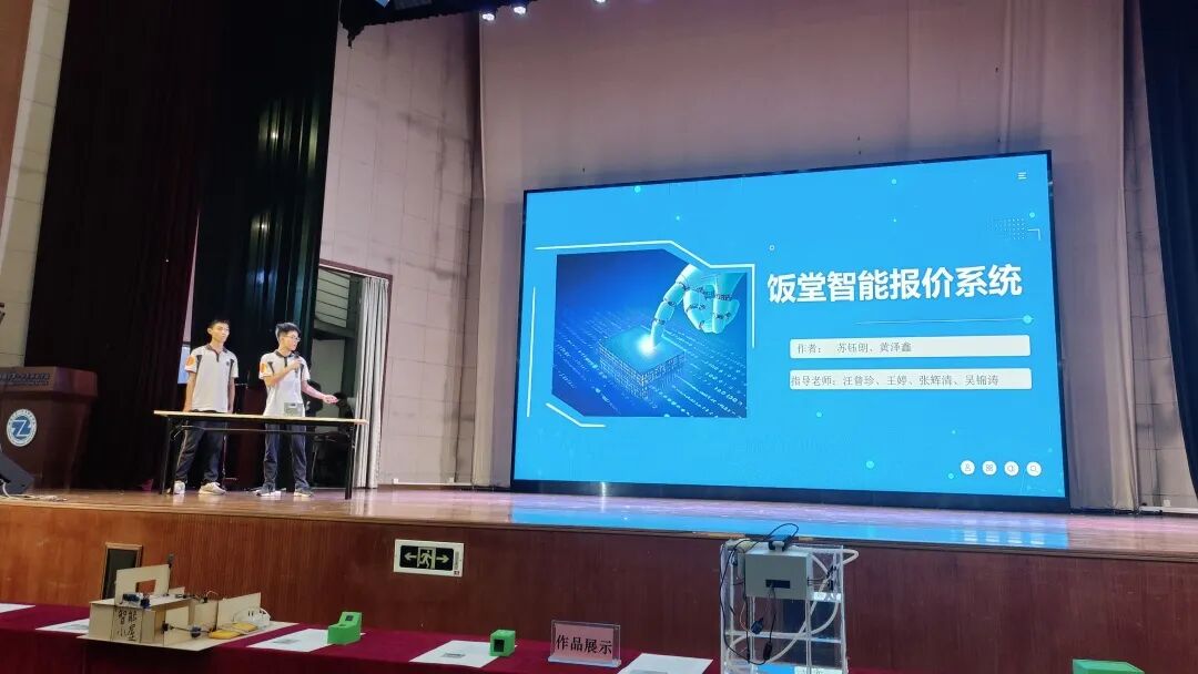 接下来,各组选手相继登场,从研发背景、产品功能、产品组成、研发过程、反思与改进等方面对作品进行介绍。本次大赛作品包括智联停车场、图书馆计人数系统、智“绘”机器人、智能校园手机箱、饭堂智能报价系统、超声波定向矩阵、智能小屋、智能血氧检测仪、WIFI天气时钟、超声波隧道水位智能检测排水系统、温湿度空气质量检测器、智能键盘生产制造系统、单发双垂尾固定后掠翼“航模”、无刷暴力风扇。
