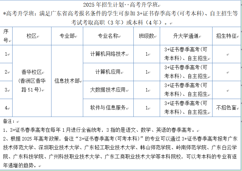 三二分段班与广东科学技术职业学院软件技术专业开展中高职三二分段对接培养招生50人,考核合格可升入到高职院校就读大专。高考升学班可以通过“3+证书”高职高考和自主招生考试升入本科或大专院校继续深造。