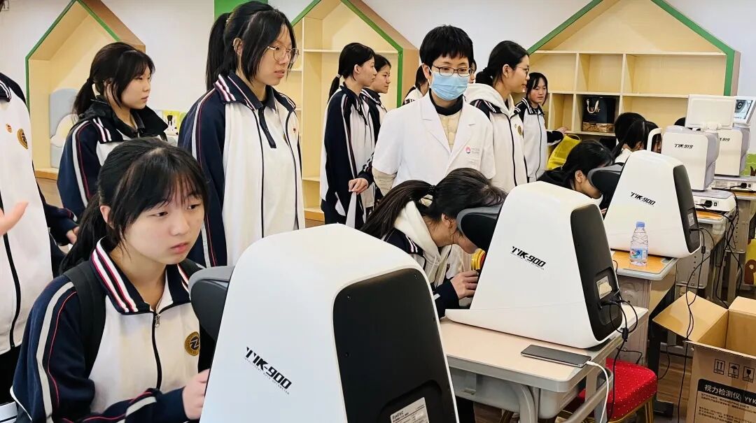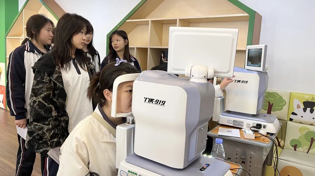 电脑验光:通过智能自助验光仪初步测量学生的屈光度,包括近视、远视和散光情况。