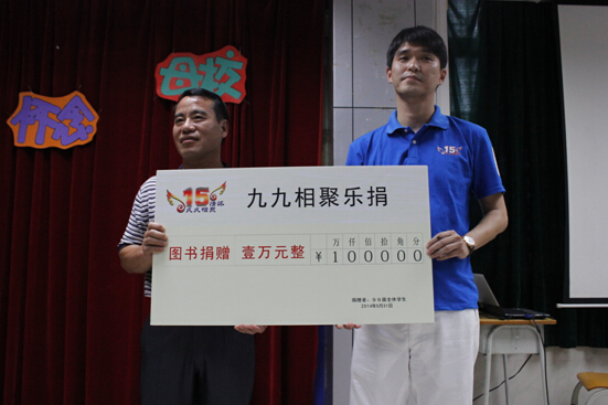 在A104的集会上,同学们纷纷上台,向母校和老师汇报自己的成绩,表达对母校的感恩和思念,当年的老校长詹红红校长及现任校长甘朝威校长也在会上发表讲话,对同学们毕业十五年来,积极创业,勤奋工作给予了极大的肯定与鼓励,同时也祝愿同学们身体健康,家庭幸福,事业再上新台阶。会上,为表达对母校的感恩之情,全体同学为参加聚会的老师献上一份精美礼品,为母校图书捐资10000元,捐赠凳子1000张,希望师弟师妹们喜欢读书,乐于活动,不忘师恩,感恩母校。