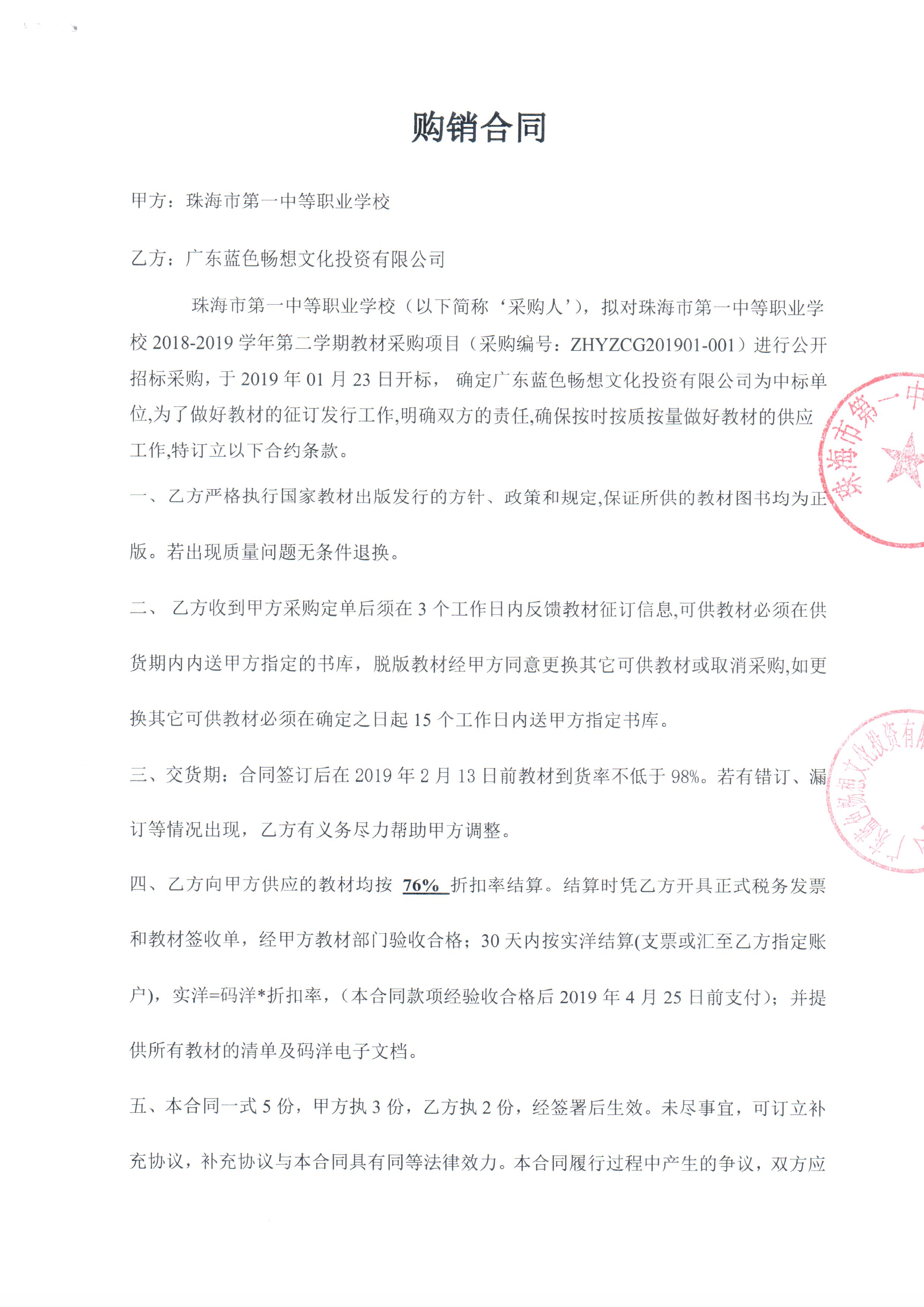 珠海市第一中等职业学校2018-2019学年第二学期教材采购项目于2019年1月18日公告,网上竞价审核工作已圆满结束,现将成交人名单公告及合同公示如下: