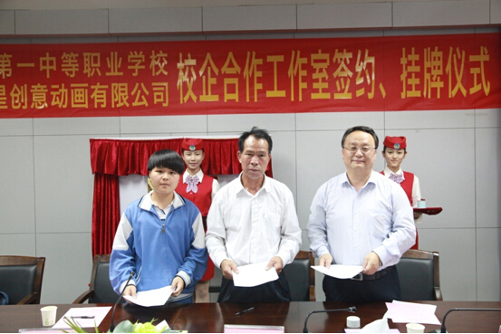 仪式上,明星创意动画公司罗皑容总监在讲话中指出,我校艺术设计部拥有较强的动画设计专业设备和师资力量,学生具备优良的专业素养和职业素养。我校学生蔡哲超、郑海鹏和谢晓等在该公司实习期间表现优秀,赢得了企业的高度评价。其中郑海鹏同学还被评为年度“最佳新人”。罗皑容总监相信我校学生一定会朝着梦想前行,回馈社会。最后,我校仇建平书记强调,与明星公司的合作是学校之荣幸、职教之春天。我校在示范校建设的背景下,也将一如既往地坚持育人为先的发展理念,根据企业和市场需要,积极培养“三高”型人才。