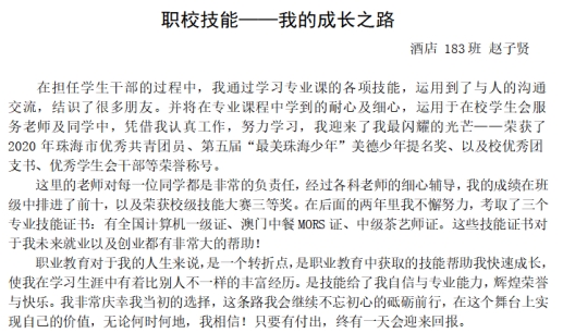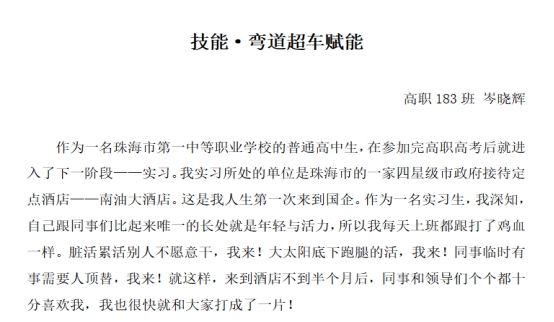 为贯彻落实全国职业教育大会精神,展示职业教育发展的新成就,宣传职业技能创造美好生活,营造重视技能、崇尚技能的良好氛围,我校外联处组织18级顶岗实习学生参与广东省教育厅组织的“技能:让生活更美好”主题作品征集活动,多种形式推进技能教育的创新与改革,不断探索技能人才培养新模式,用实际行动向党的百年华诞献礼。