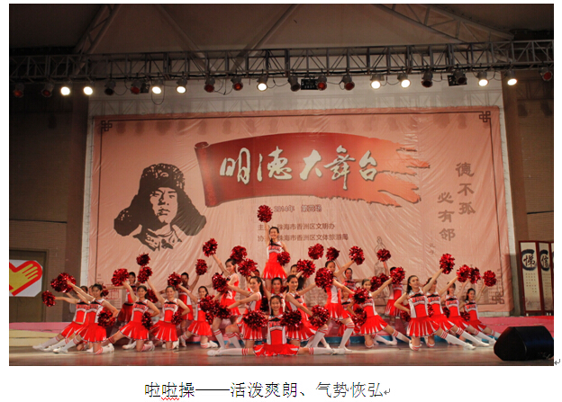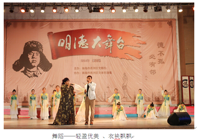 2014年5月30日晚上7点30分,由珠海市香洲区文明办,珠海市文体旅游局联合举办的明德舞台第4期在柠溪文化广场隆重举行,我校大型礼仪操、啦啦操和舞蹈《爱上珠海爱上你》闪亮登场,整台晚会,我校登场的三个节目可谓高雅大气、韵味十足(礼仪操),活泼爽朗、气势恢弘(啦啦操),轻盈优美 、衣袂飘飘(舞蹈),带给人头攒动的活动现场美奂美仑的视觉冲击,让现场观众为之一震,纷纷拿出手机,进行拍摄。同学们积极向上的精神面貌,文明守礼的个人素质给举办方和现场观众留下了深刻印象。
