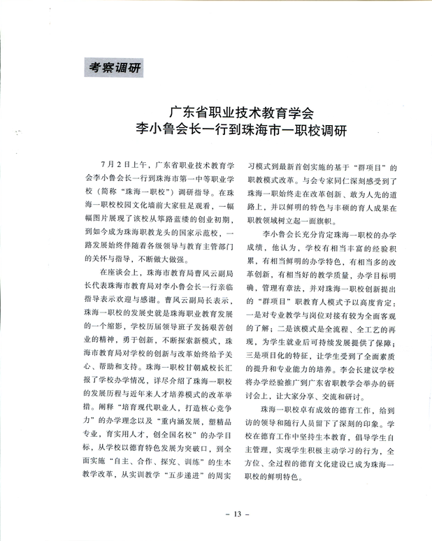 广东省职业技术教育学会李小鲁会长一行到珠海市一职校调研